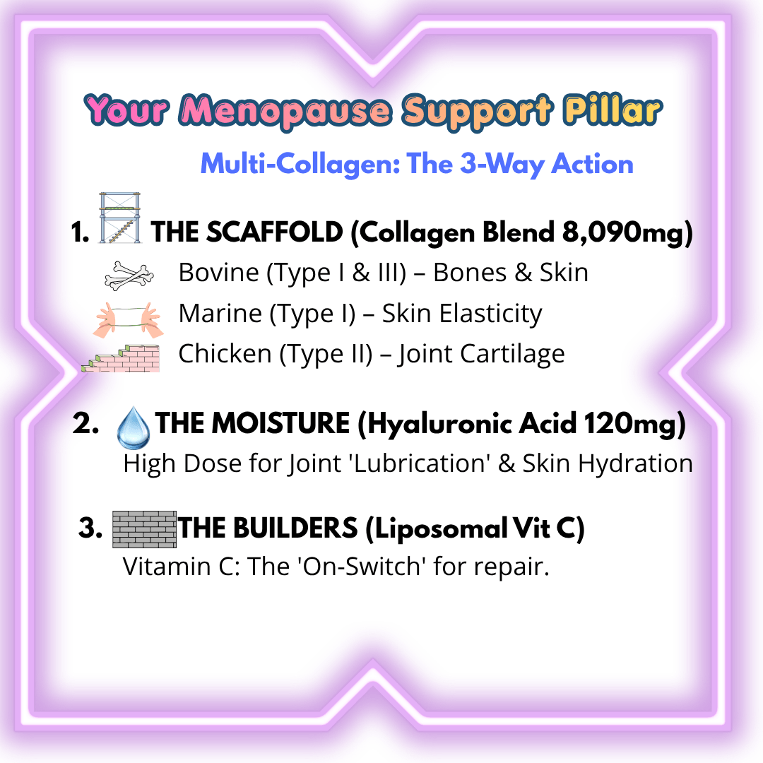 The Scaffold: you need a multi-source collagen blend (Bovine, Marine, and chicken). This covers your bones, your skin, and that crucial joint cartilage.